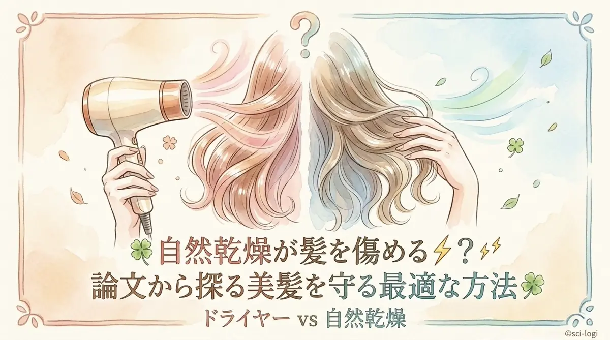 こんにちは。さいろじ研究所へようこそ!科学と論理の妖精「さいろじくん」だよ。今日は髪の毛の科学に迫っていこう。実は僕も、論文を読むまでは「熱を与えない自然乾燥の方が髪に優しい」と直感的に思っていたよ。でも、この習慣が髪を内側からボロボロにしている可能性があるんだ。近年の研究で、自然乾燥はドライヤーの使用よりも髪の内部組織に深刻なダメージを与えることが明らかになっているよ。
