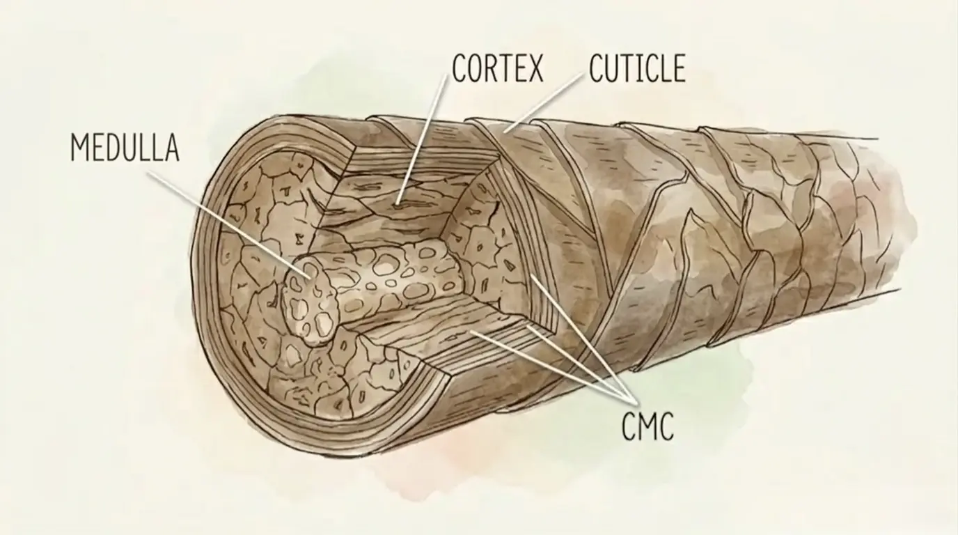 CMC(Cell Membrane Complex)は、キューティクル細胞同士、あるいはキューティクルとコルテックスを強固に結合する「接着剤」として機能するよ 🍀。でも、このCMC領域やさっき説明したエンドキューティクルは、薬剤の通り道になりやすくて、化学的処理に対して非常にダメージを受けやすい弱点でもあるんだ ⚡。
