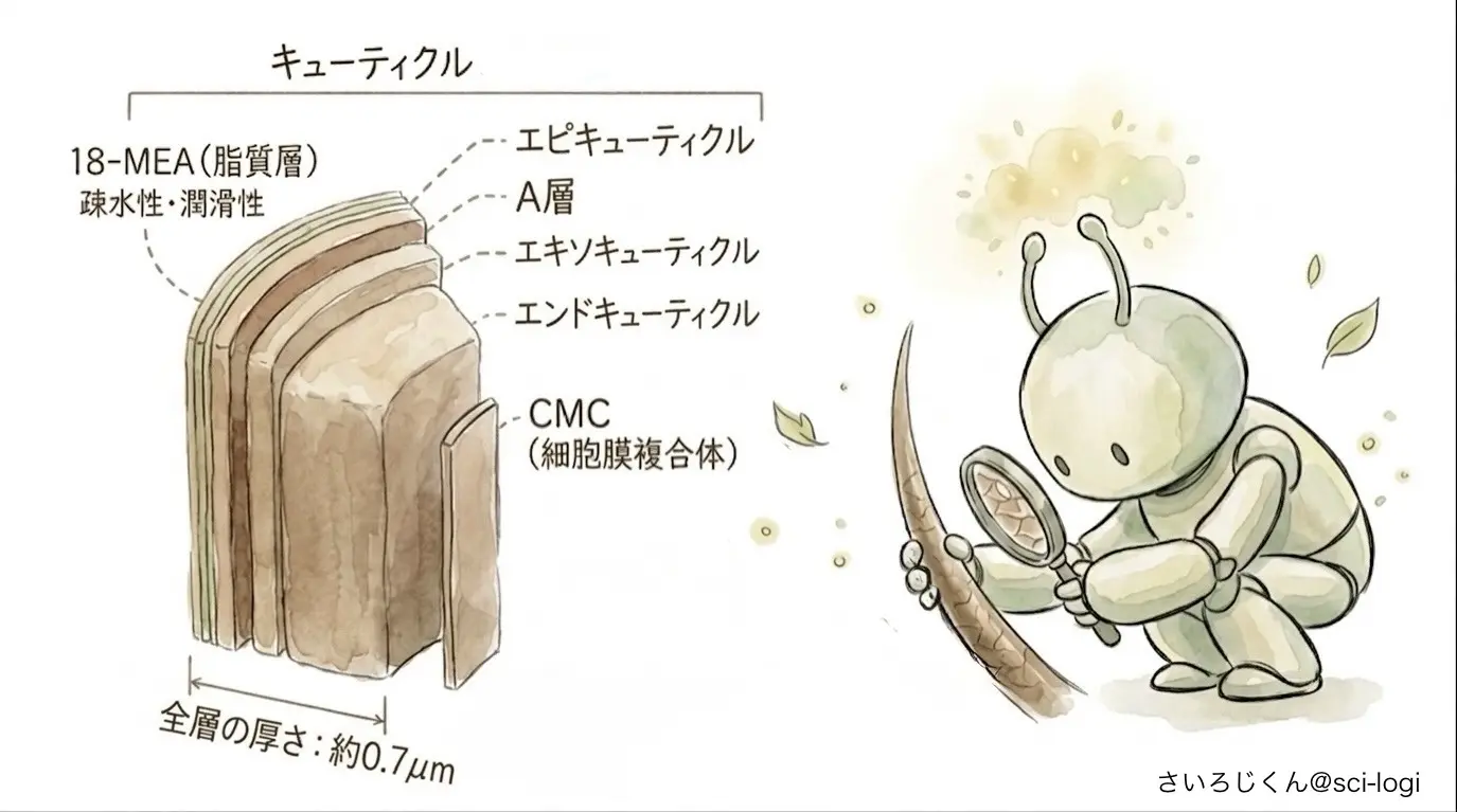 キューティクル細胞1枚の内部も、さらに細かな層に分かれているんだ。