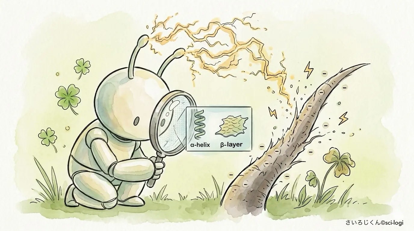 αヘリックスとβレイヤー- タンパク質の構造変性(弾力低下):髪のケラチンタンパク質は通常、バネのような「αヘリックス構造」を保っているよ。でも、髪が濡れている状態で無理な引張応力が加わると、このらせん構造が引き伸ばされて、「βレイヤー」と呼ばれるシート状の構造へと塑性変形を起こしてしまうんだ ⚡。これが繰り返されると、髪の弾力性が失われちゃうよ。